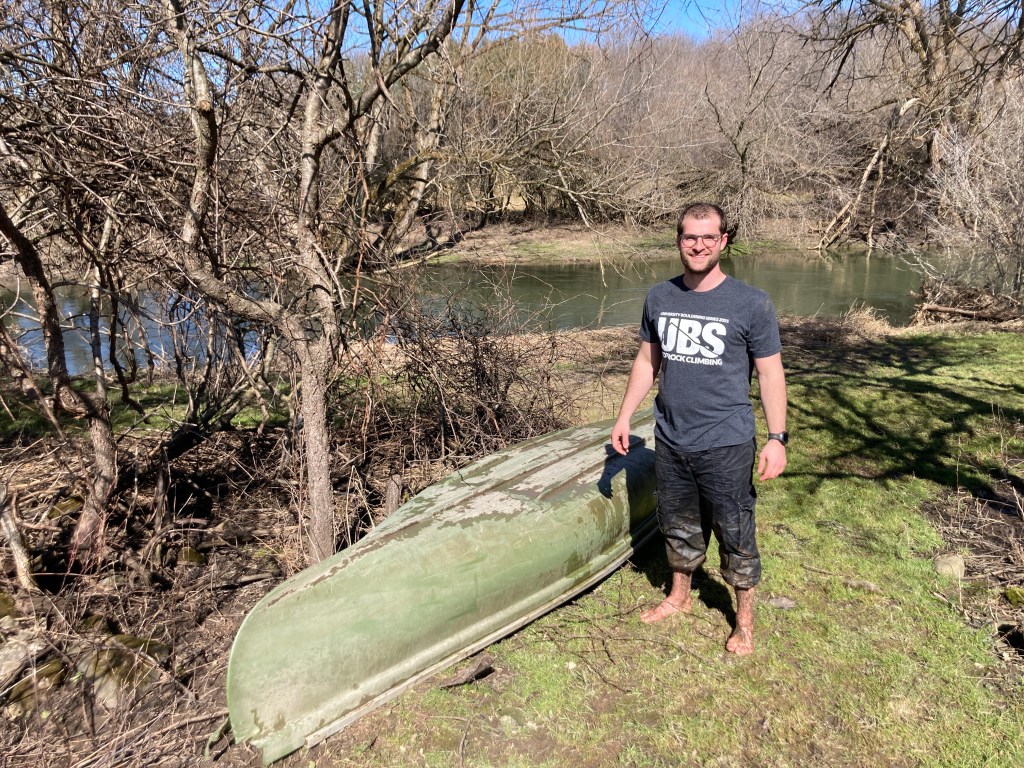 Fast forward about 8 months after coming up with this idea. In the same creek where I was planning to start the journey (fiancée’s family farm), we found a very broken canoe stuck in some trees by the bank of the river after a storm! What are the chances? A means of travel, as if the universe meant for me to complete this trip. So I swam across the river to retrieve the canoe. I decided to pole my way back with a long branch. I sat in the boat, and once I broke it in (the seat immediately broke in half), it didn’t seem so bad other than the broken prow and the holes slowly leaking with water. About half way across the river, I tried sticking my pole on the downstream side of the boat (rookie poling mistake I guess), and immediately had to drop the pole as the boat went over it. After splashing my way towards the other side and getting caught by my fiancée, I managed to safely come ashore, beaming with my brand new broken, old canoe like a dog with a bone.